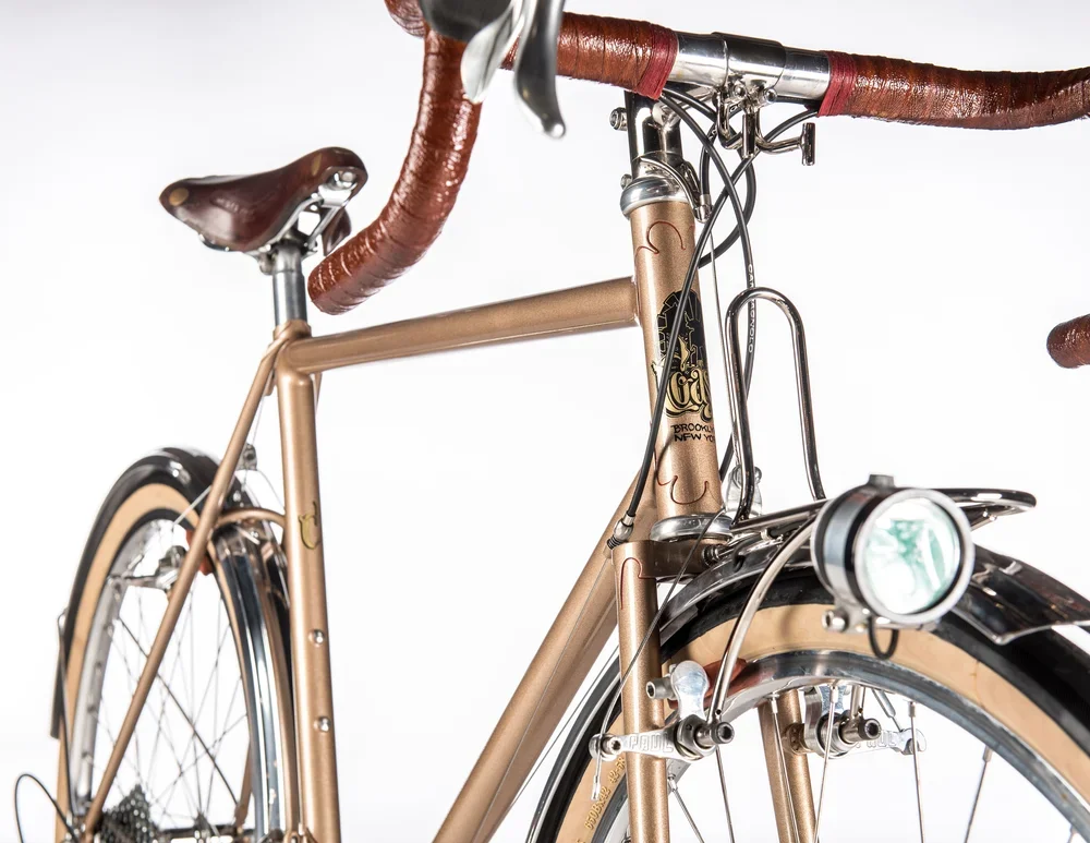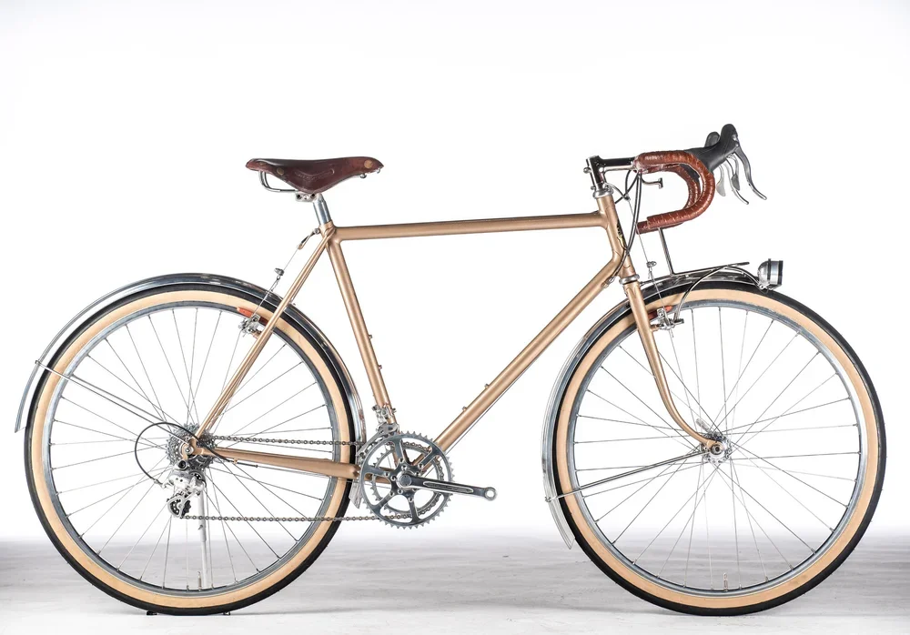 For Sale! $7,500 complete 2017 LasVegas Gold. 55X57. Bi-Lam head tube, Columbus Life tubing. RH crown and SL fork treatment with Kaisei ‘Toei Special’ Fork Blades. 650B X42. Rack, stem hanger and decaluer. Lights front to rear (schmidt dyno and f&R lights). Paul canti, white industries hub. Currently has an old school brooks, stronglight 49D cranks… Campy record 11 spd derailures and controls. RH tires…. Complete, serious rando machine.